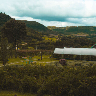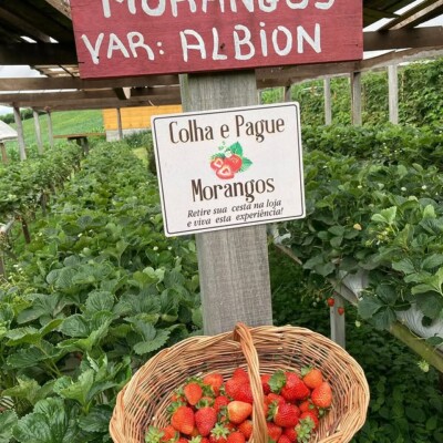 Vamos passear em meio ao parreiral de uva bordô e pelo pomar onde são cultivados morangos, framboesas amoras, mirtilos (blueberries), pêssegos, laranjas, bergamotas, figos e outras frutas com a experiência de colha e pague nas respectivas safras.